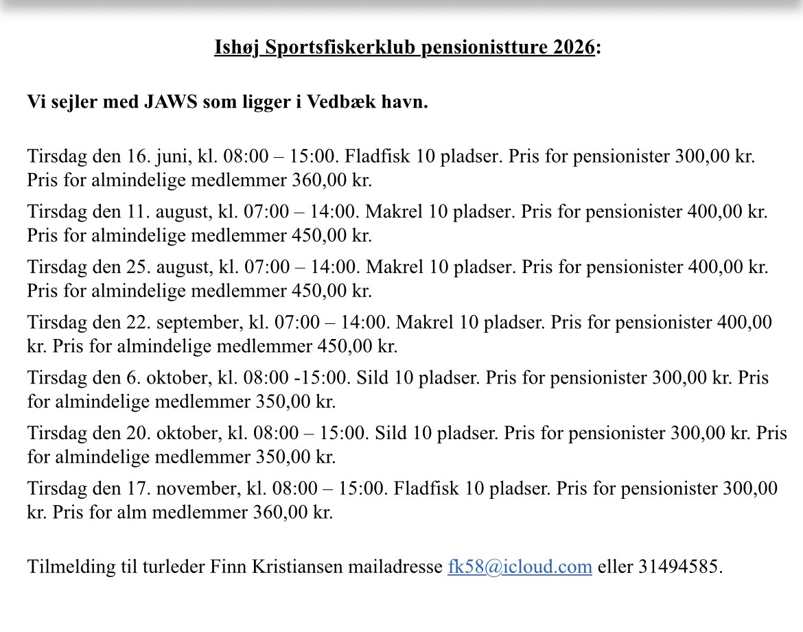 Er du til frisk luft – godt kammeratskab og masser af fisk, så kontakt Finn Kristiansen, tlf. 31494585, som også er fast turleder på pensionist-/hverdagsturene. Henvendelse kan evt. også rettes til Svend Andersen tlf 60895639.